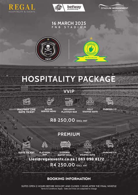 Ticket prices for the Orlando Pirates vs. Mamelodi Sundowns MTN 8 match in 2025 will vary depending on seating location and the demand for tickets. You can expect a range of prices, from more affordable options in general admission areas to premium seating with better views and amenities. Expect to pay more for seats closer to the field and in the most desirable sections. Ticket prices are also influenced by the popularity of the match and the stadium’s capacity. Premium seats often come with additional perks, such as access to exclusive lounges, better views, and premium food and beverage options. However, it’s worth noting that even general admission tickets offer an incredible experience, allowing you to be part of the vibrant atmosphere and support your team alongside fellow fans. It is recommended to compare prices and seating options across different vendors to find the best deal that matches your budget and preferences.