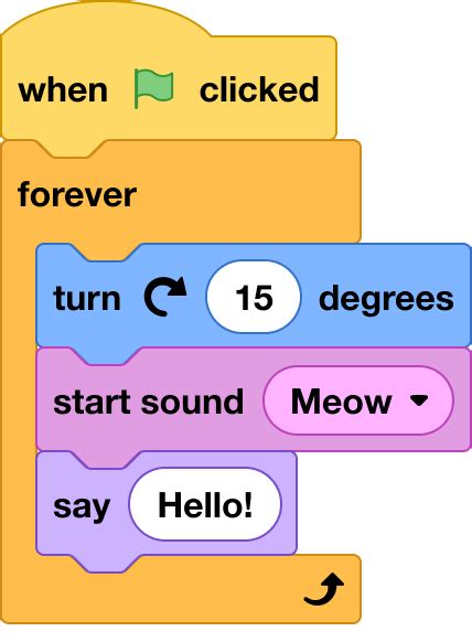 Control blocks, orange, provide control structures like loops and conditional statements. You’ll find blocks like “wait 1 second,” “repeat 10,” “if then,” and “if then else.” These blocks allow you to create complex and dynamic behaviors in your project. You can use loops to make your sprite repeat an action multiple times, conditional statements to make your sprite behave differently based on certain conditions, and wait blocks to control the timing of your scripts.