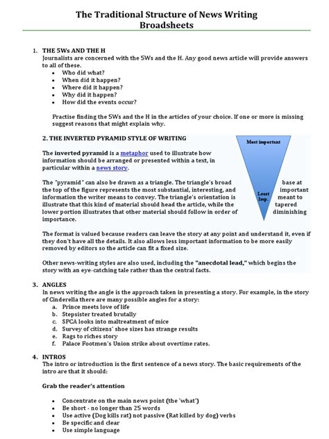 Let’s talk more about the inverted pyramid structure , because it’s the secret sauce behind how most news is organized. It’s a storytelling technique where the most important information is presented first, followed by progressively less important details. Imagine flipping a pyramid upside down, so the widest part is at the top. The lead is that widest part, containing the most critical facts. As you move down the pyramid (further into the article), the information becomes more specific, then provides background, and finally, offers less essential details or context. Why do journalists use this? Several reasons make it incredibly effective . Firstly, it caters to busy readers. If you only have a minute, you can read the first paragraph and still get the main story. Secondly, it’s useful for editors. If a story needs to be cut for space, they can simply trim from the bottom of the article without losing the essential news. This flexibility is invaluable in the fast-paced world of news production. Thirdly, it helps readers digest complex information easily. By starting with the ‘what matters most,’ it provides a clear framework for understanding the rest of the details. The inverted pyramid ensures clarity and efficiency in news reporting. It prioritizes the reader’s time and ensures that the core message of the story is always accessible, regardless of how much of the article is read. It’s a practical approach that has stood the test of time, making news consumption more efficient and effective for everyone involved.